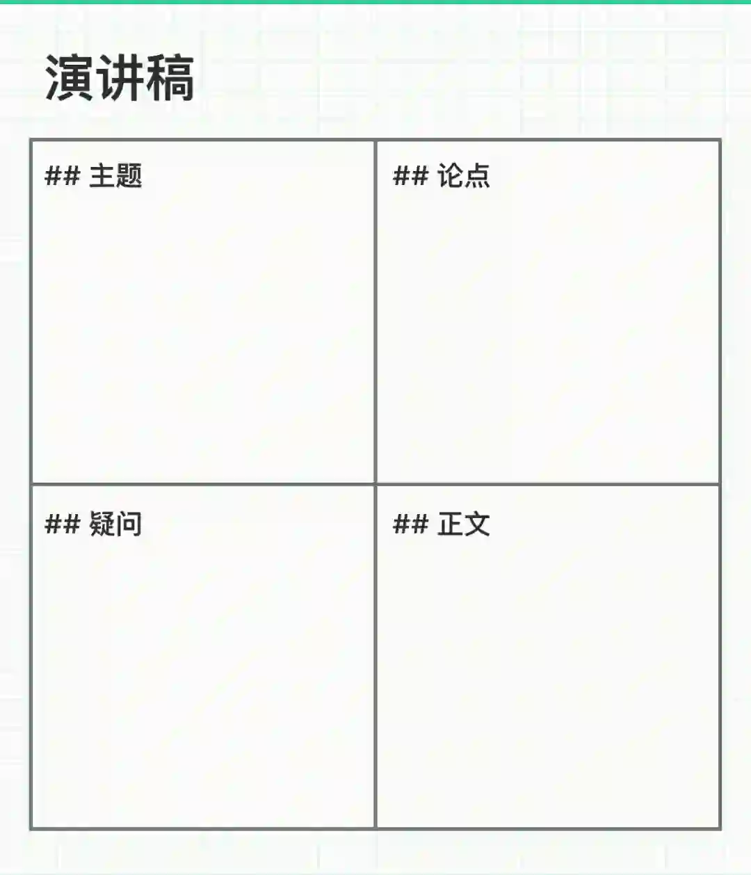 演讲在国内可能并不是特别受重视,然而演讲是一种非常有利于帮助锻炼自身逻辑能力的一种方式。格子笔记中将其分为:主题、论点、疑问、正文,依次逐序的帮助我来完成演讲稿,保证后续正文不偏离我原始的主旨关系。