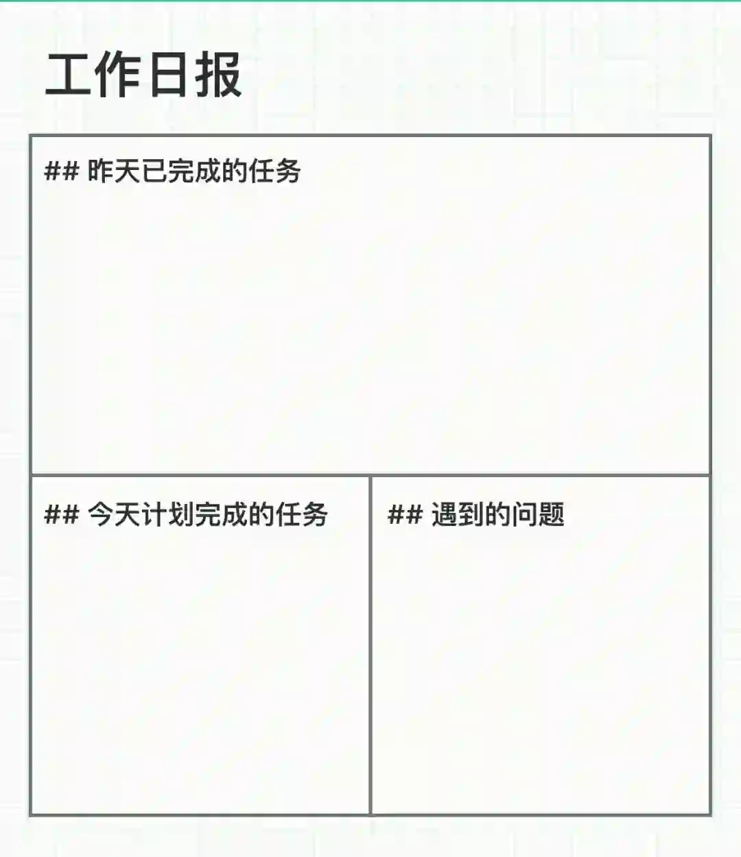 工作日模板,分为 3 块,昨日完成的任务,今天计划完成的任务,遇到问题;每天在 GTD 软件里完成的任务非常多,还有不少繁琐的日常事件,而通过工作日报模板能够不仅能够回顾昨日已经完成的任务,还能整理今天所要做的任务,同时还能跟踪昨日工作时遇到的问题。当然这个模板也适合需要提交每日工作报告的人使用。