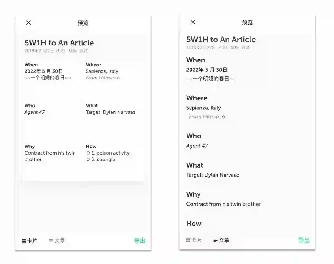 而进入浏览则有2种不同的浏览方式,一种是卡片方式,另外一种是文章方式。卡片方式和编辑时候几乎是一样的,适合查看信息量较少的情况或者查看整体笔记构架的情况;文章方式则是尽可能的展现完整信息的样式,适合查看这个笔记完整信息量。