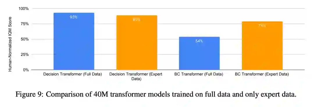 与从专家示范中学习相比,从包括一些专家数据但主要是非专家数据的大型多样化数据集中学习有助于学习和提高性能。为了验证这个假设,研究者根据 episodic returns 过滤了每个游戏的训练数据,并且只保留前 10% 的轨迹,以生成一个专家的数据集 (详情见附录 E)。他们使用了这个专家数据集来训练多博弈决策 Transformer(DT-40M) 和基于 Transformer 的行为克隆模型(BC-40M)。图 9 比较了这些模型训练的专家数据和 DT-40M 训练的所有数据。