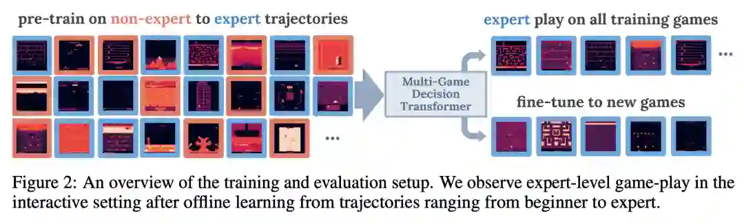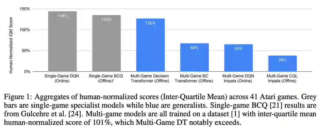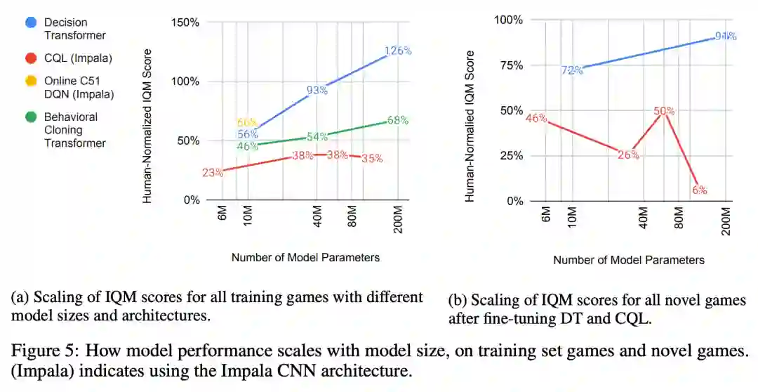 研究发现,在对离线专家数据集和非专家数据集进行训练之后,智能体可以在所有游戏中同时达到人类级别性能的 126%,如图 1 所示。此外,研究者还发现了与语言和视觉领域相似的趋势:用很少的数据快速适应从未见过的游戏(第 4.5 节) ,性能和模型大小之间的幂律关系(第 4.4 节) ,以及为更大的模型提供更快的训练进度。