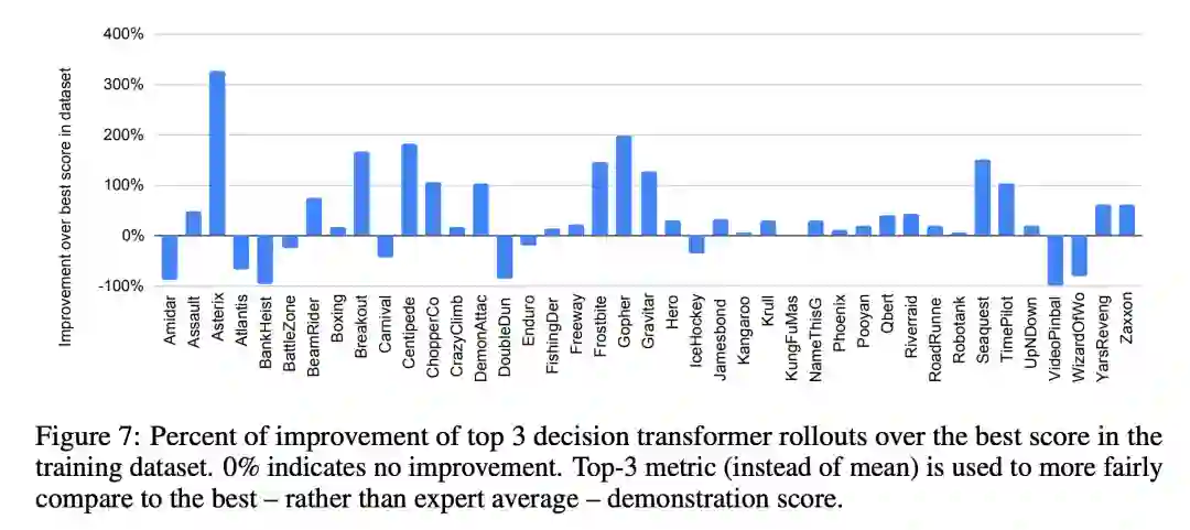 研究者想要评估的是,带有专家行动推理的决策 Transformer 是否能够超越最好的演示在训练中展现的能力。为了做到这一点,研究者看了表现 top 3 的决策 Transformer 模型的 rollout。他们使用了 top 3 的 rollout,而不是所有 rollout 的平均值,以更公平地比较最好的演示,而不是一个普通的专家演示。图 7 中展示了对比单个游戏的最佳演示得分提高的百分比,在一些比赛中,实现了训练数据的显著改善。