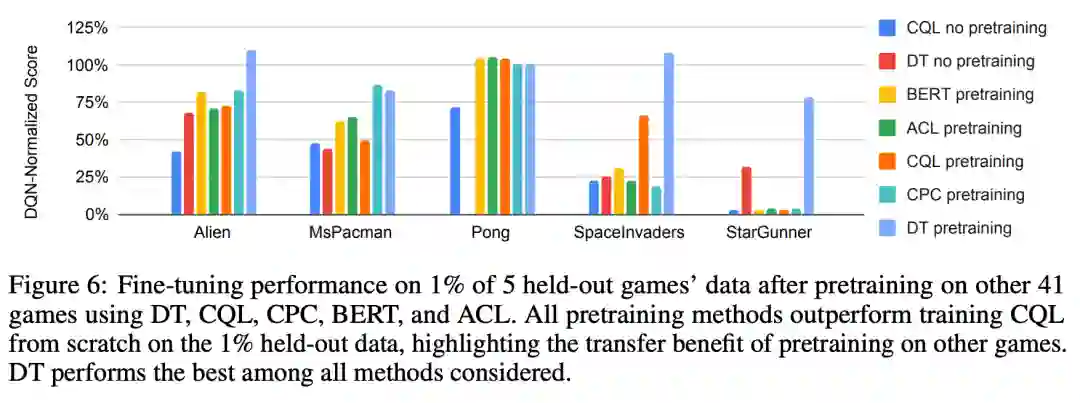 尽管雅达利游戏是一项自然而且动机良好的任务,但是由于它与人类如何将知识转移到新游戏的相关性问题,对于快速适应新游戏的预训练还没有被广泛探讨。Nachum 和 Yang 针对 Atari 的大型离线数据和小型专家数据进行了预训练,并与基于互模拟的一系列状态表征学习目标进行了比较,但是他们的预训练和微调使用的是同一个游戏。相反,本文研究者感兴趣的是经过训练的智能体迁移到新游戏的能力。