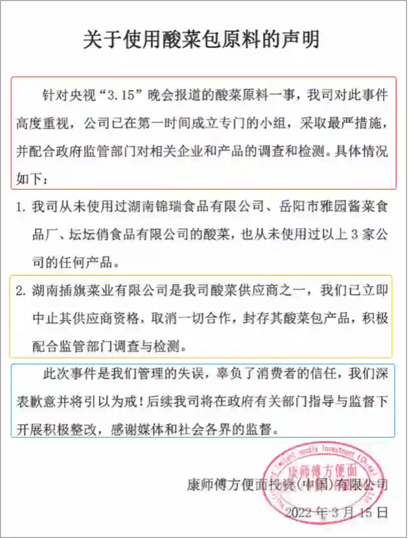 在查看之前,我们先看下今年康师傅在315上被点名之后所发表的声明。