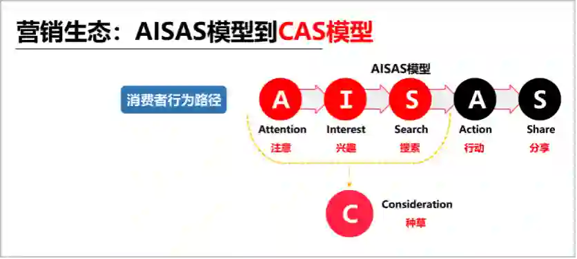在小红书,一个笔记发布出去后是一个靠相同兴趣的人、相同的标签、关键词、购买搜索等各方面的数据来分析是否得到平台增流,小红书的传播与传统平台AISAS整合营销模型不同,它是通过CAS模型来实现传播的。