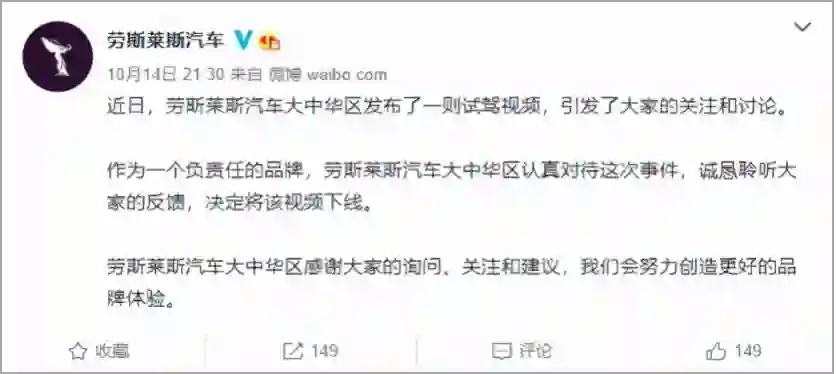 更有甚者,部分品牌在代言人因为不当言论被官方点名批评后还不愿意发出解决声明,更是丢掉唯一的“路人缘”。譬如之前网络红人晚晚代言劳斯莱斯,一瞬间招来了很多消极点评,许多劳斯莱斯车主在此条微博短视频下“言传身教”。