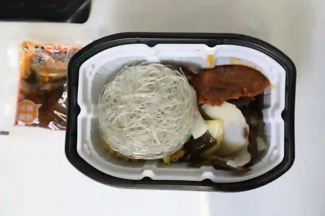 牛腩块绝对是我们这次测得自热锅里最扎实的,你看它真的是一整块的牛肉耶!粉丝爽脆,没有出现其他品牌粉丝煮久断掉的情况。
