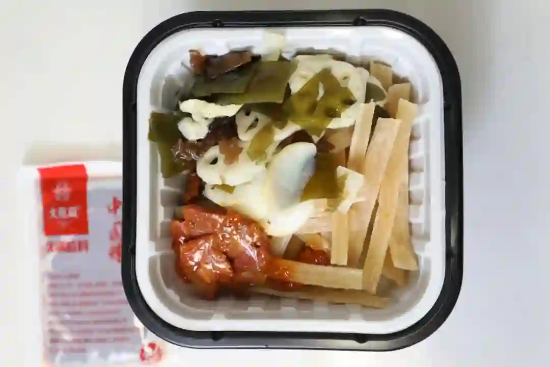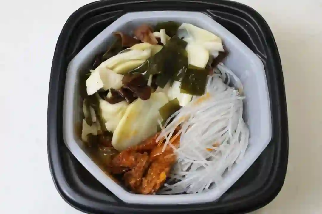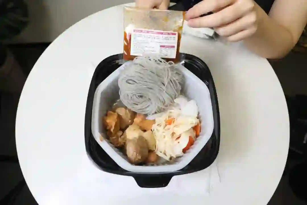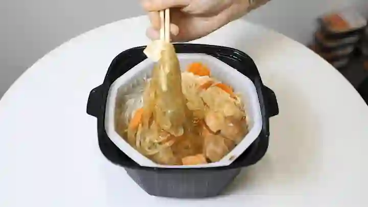 这款鸡肉锅里的素菜出奇的多,竟然还有金针菇、胡萝卜这样的隐藏款。各种食材加在一起都快从塑料碗里冒出来了,莫小仙实在人儿。