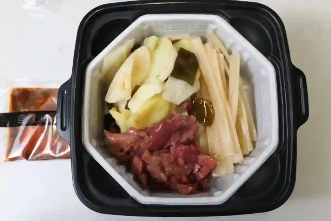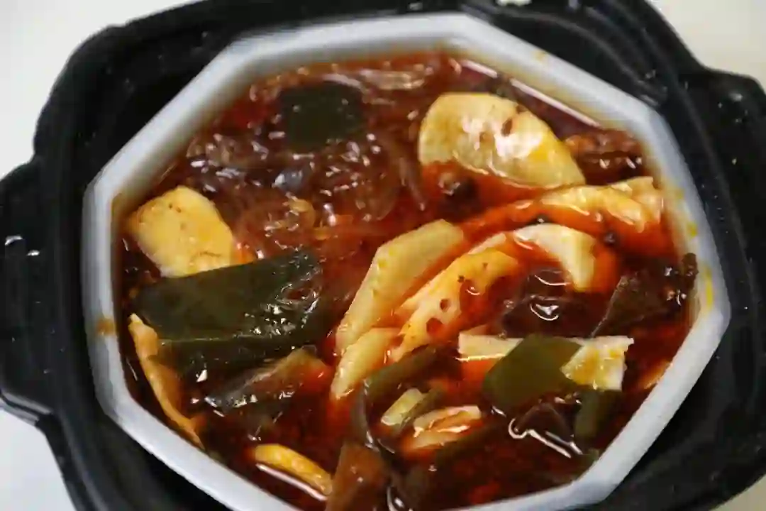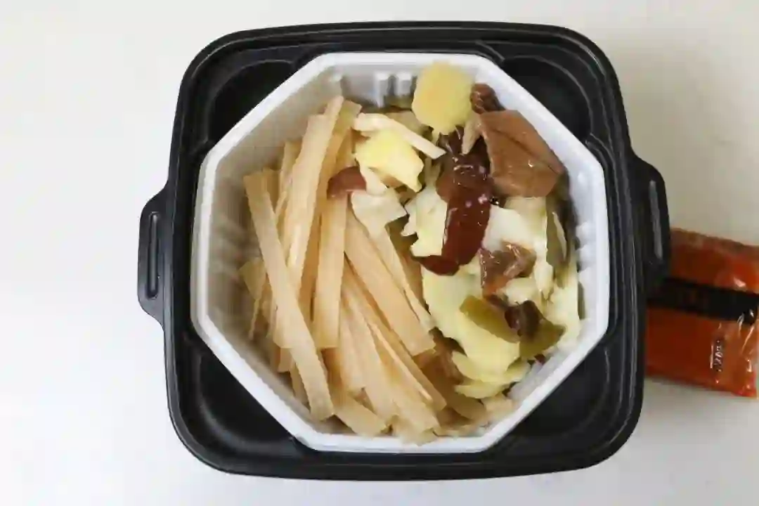 底料、麻辣牛肉片、湿粉条、酱菜包(笋、藕、海带、木耳、土豆)