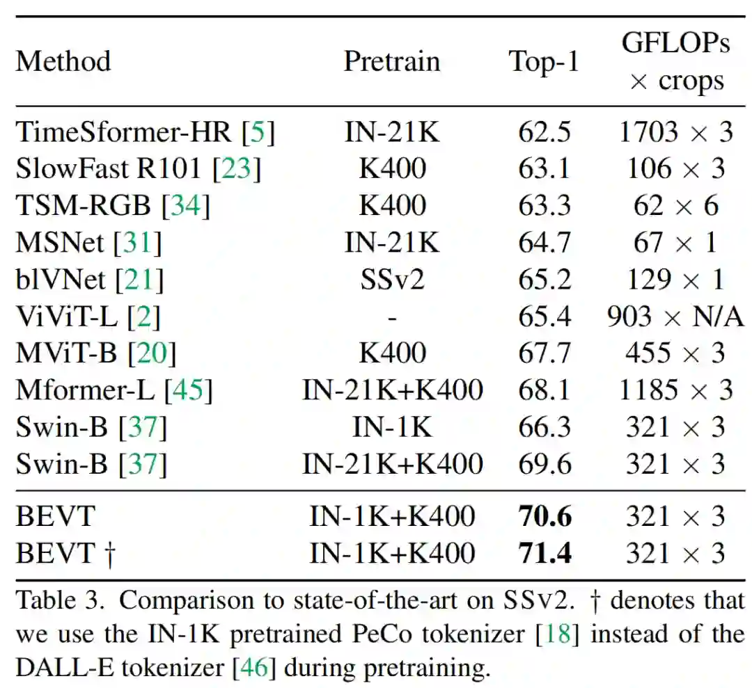 在与 SOTA 模型的比较中,可以看到,在 Something-Something v2 和 Diving48 上,BEVT 取得了明显比现有 SOTA 视频模型更好的性能;而在 Kinetics-400 上,BEVT 也取得了比计算量相近的 SOTA 模型更好或相当的性能。