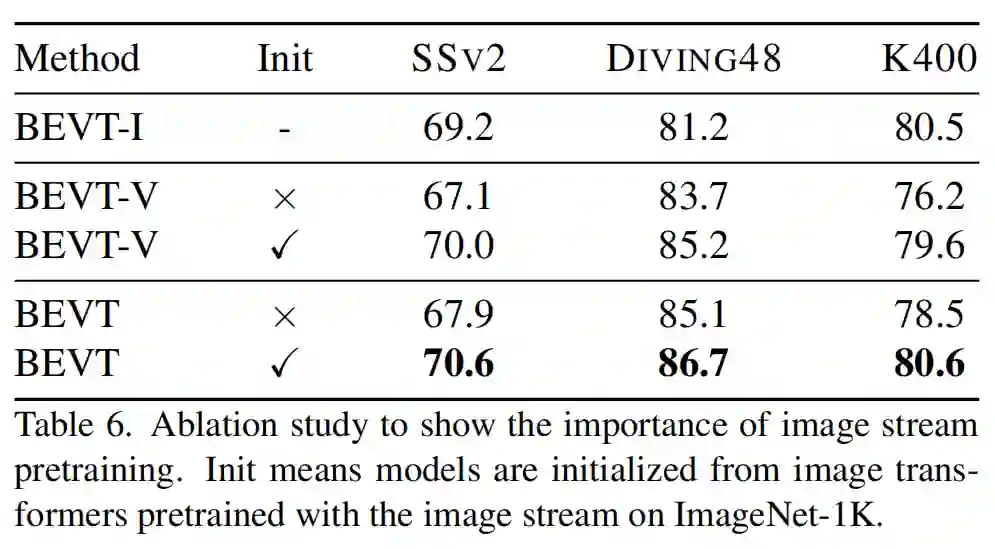 研究者发现,移除时间信息对 Kinetics-400 的预测结果影响较小,而对 Something-Something v2 和 Diving48 的预测结果影响相当大。这说明大部分 Kinetics-400 视频仅需通过空间信息线索即可被正确识别,而时间动态信息则对于 Something-Something v2 和 Diving48 视频的识别非常重要。因此,对于空间信息线索占主导地位的数据集(如 Kinetics-400),大规模图像数据集上的预训练便可带来可观的性能,额外的视频通路预训练对性能提升影响不大;而对于十分依赖时间动态信息的数据集(如 SSv2 和 Diving48),BEVT 中视频通路预训练的作用十分关键。