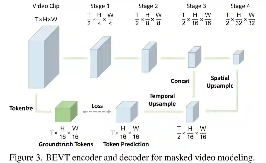 BEVT 包含了图像通路和视频通路,而它们各自包含一个编码器 - 解码器模型架构。BEVT 使用 Video Swin Transformer 作为图像通路和视频通路的编码器,进行自监督表征学习。由于 Video Swin Transformer 是从 Swin Transformer 扩展而来的层次化架构,token 序列组成的特征图会在时空维度上被降采样。