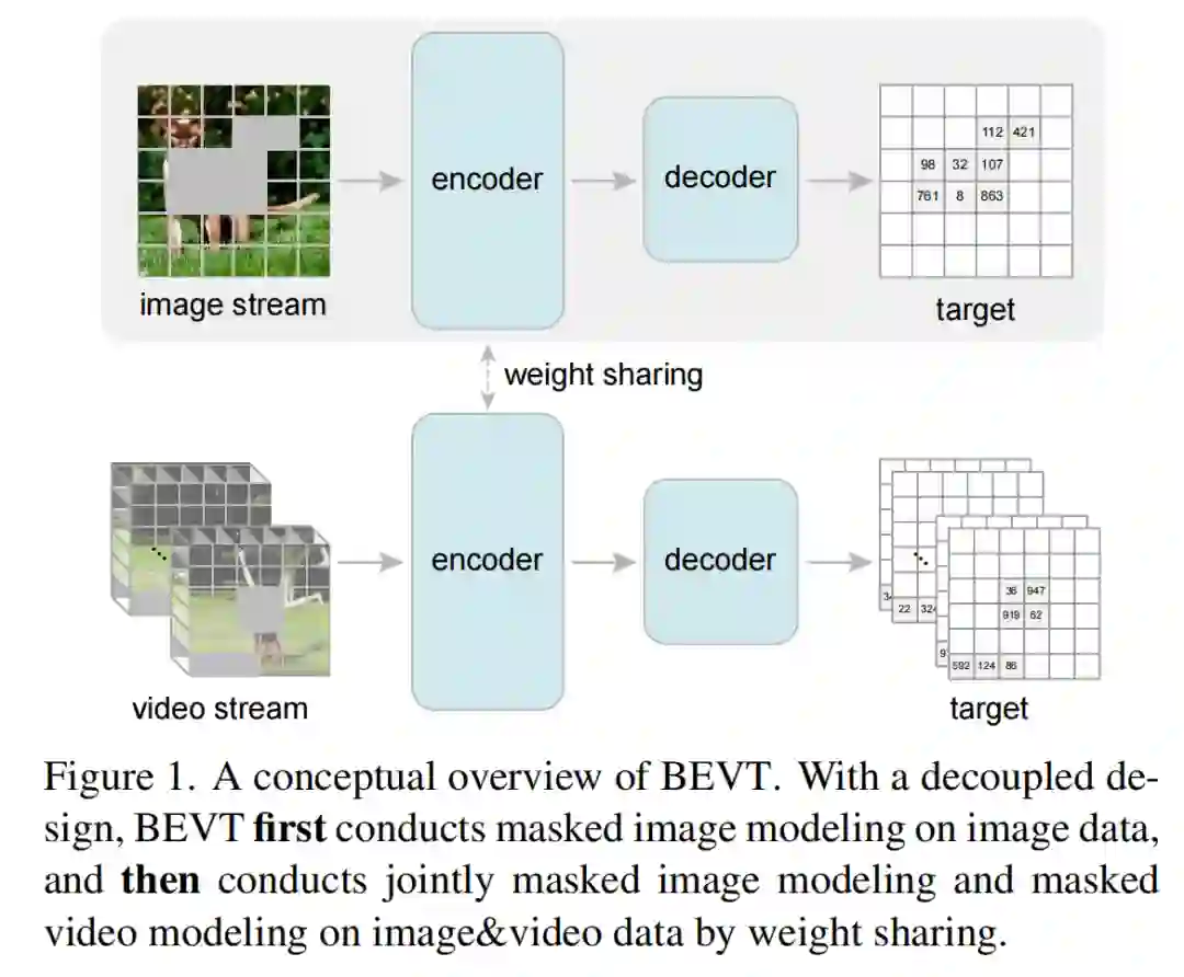 BEVT 的目标是通过自监督方法学习对相对静态视频和动态视频都有效的视频表征,从而在迁移到不同视频数据集上时都能取得良好的性能。这意味着视频 Transformer 需要同时学习到良好的空间信息表示和时间动态信息表示。