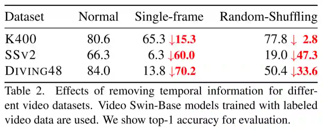 为了进一步理解 BEVT 和其他预训练 Baseline 在不同数据集上的迁移性能差异,研究者设计实验探究了 3 种视频识别下游任务对时间信息的依赖程度。将 Video Swin Transformer 在三种视频数据集上进行测试时,研究者尝试通过 2 种方式将视频输入中的时间信息移除:(1)Single-frame:使用其中 1 个视频帧代替视频片段中其他帧;(2)Random-Shuffling:在时间维度上随机打乱视频帧输入顺序。