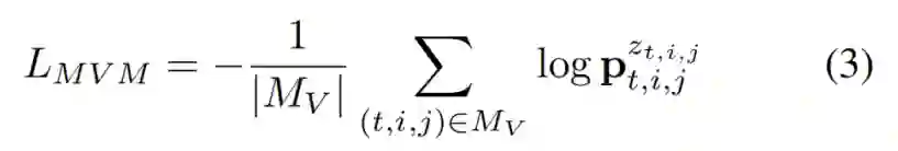 在 BEVT 的双路训练中,掩码图像建模和掩码视频建模的目标都是最大化掩码位置对应的 Groundtruth 视觉 token 的对数似然: