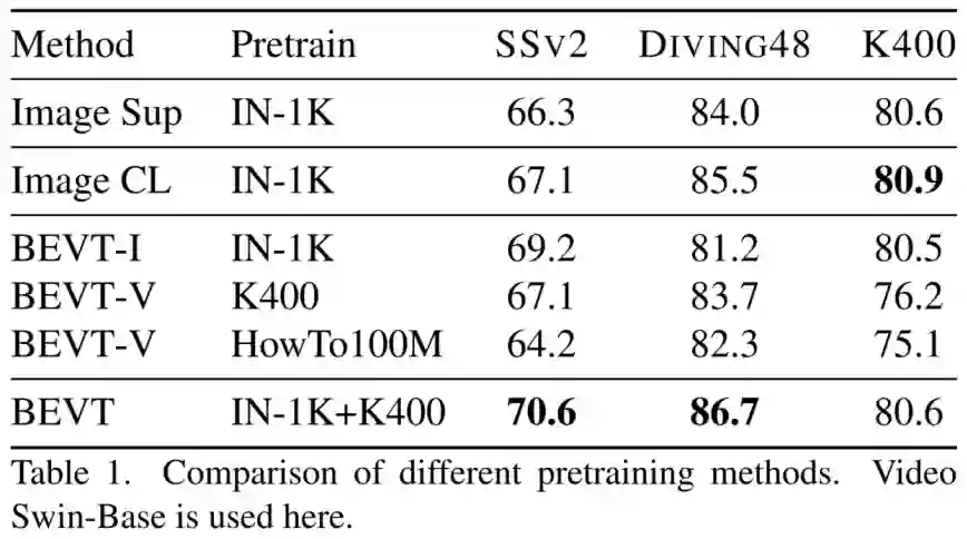 由于在大规模视频数据上从头开始预训练视频 Transformer 十分低效,BEVT 首先在 ImageNet-1K 上自监督预训练图像通路,使模型学习到良好的空间表征;之后再用图像通路模型初始化视频通路模型,进行双路联合自监督训练,其中掩码图像建模任务使 Transformer 模型保留了空间信息表征能力,掩码视频建模任务使模型学习如何提取视频中的时间动态信息。这种策略不仅使得 BEVT 更加高效,而且使得预训练得到的模型能够对不同类型的视频提取不同的判别性特征。