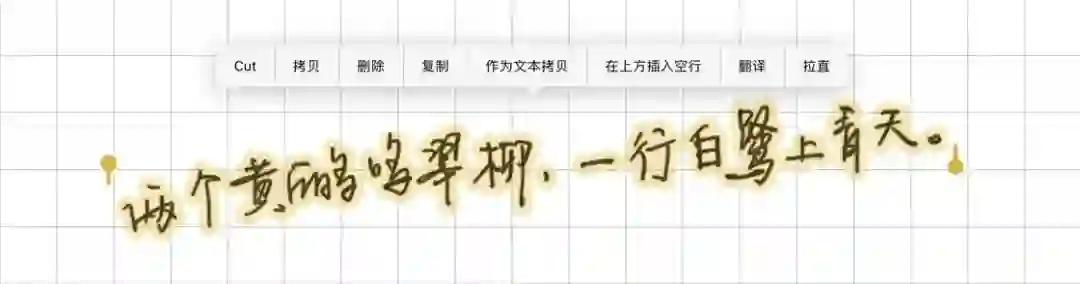 首先,Apple Pencil 的笔迹支持自动拉直。如果在手写备忘录时发现自己的笔迹是「一行白鹭上青天」,选中这些笔迹后,在上下文菜单中选择「拉直」即可把所有笔迹文字拉到同一水平线上。