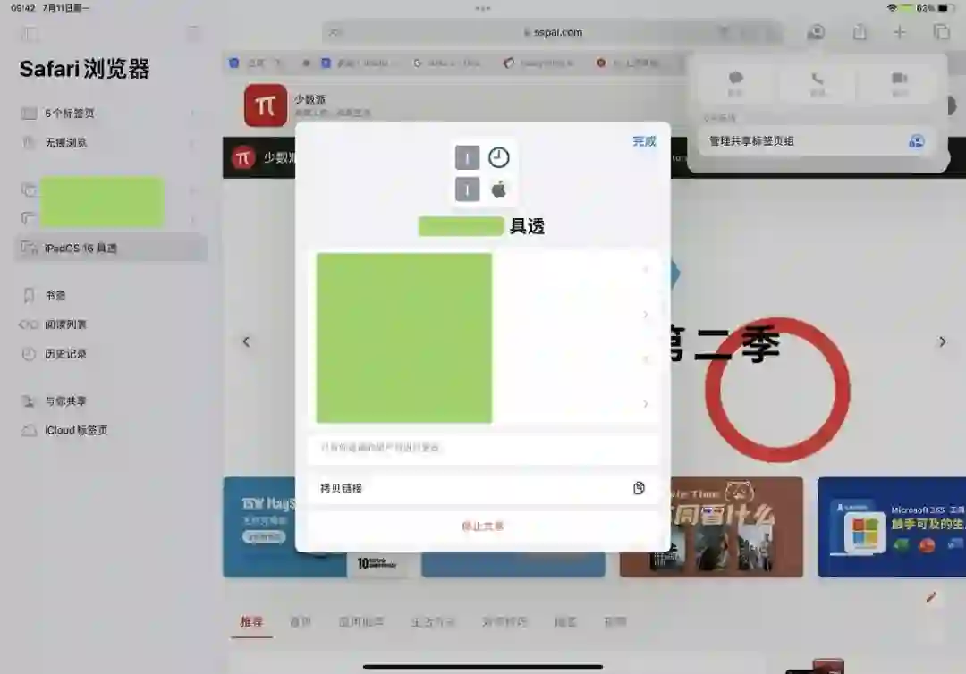 在 iPadOS 16 的公测版中,已经可以启用 iCloud 共享标签页组了,而且可以将链接共享至 iMessage 群组,群组中的所有成员都会收到邀请,Safari 浏览器中也会提示哪些标签页当前处于共享状态,还可以查看组内成员的在线状态,并一键发送消息、拨打电话、开启视频通话。