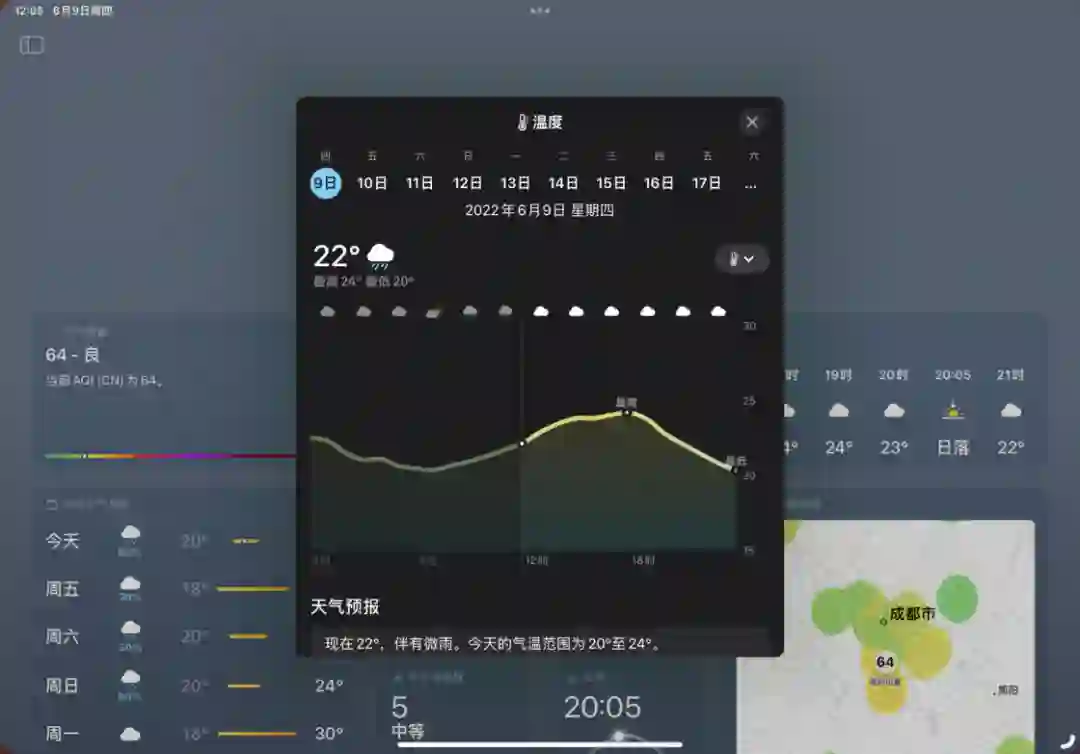 iPadOS 16 也终于为 iPad 带来了「天气」app。与 iPhone 上此次 iOS 16 更新的「天气」app 一致,现在在 iPad 上点击不同的气象模块可以显示美观的统计和趋势图,揭示相关天气指标的变化和趋势。