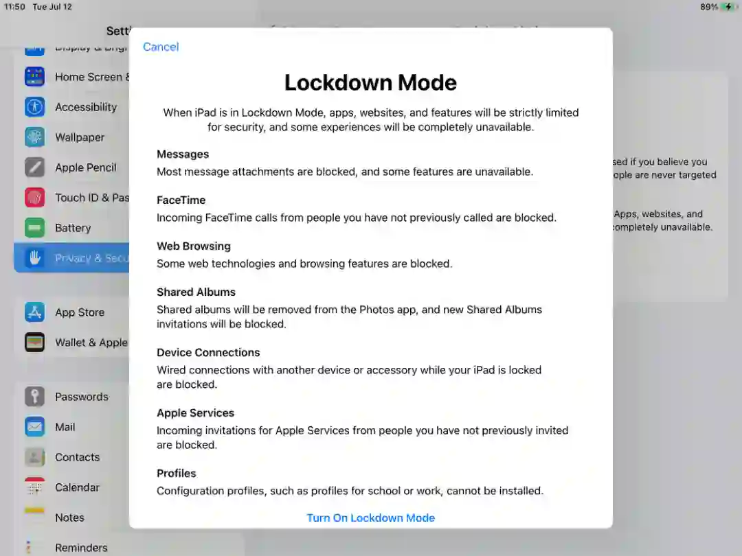 iPadOS 16 公测版也允许使用 Lockdown 模式,Lockdown 旨在为极少数用户提供可选的极端保护。在开启该模式以后,iPadOS 信息会将图片之外的绝大多数信息附件类型将被拦截、链接预览等部分功能将被禁用,Safari 浏览器会禁止用户设定白名单之外的网站使用 just-in-time (JIT) JavaScript 编译器等部分复杂网络技术,拒绝所有未经允许的 FaceTime 通话,锁定设备时与电脑或配件的有线连接也将被拦截,Lockdown 模式开启后将无法安装配置文件且设备无法加入移动设备管理。这些措施有助于减少大幅减少受攻击面,以免给具高度针对性的间谍软件可乘之机。