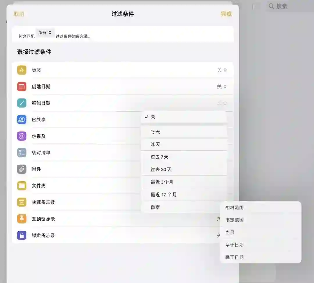 备忘录的整理归档也得到了一定程度的改进。现在在默认情况下,所有备忘录按更新日期被归类到了一起,比如「今天」「近 7 天」「近 30 天」等。另外,在文件夹创建的过程中,我们可以使用许多过滤条件来创建「智能文件夹」,除了能够将以往创建的备忘录按条件筛选外,还可以把今后创建的备忘录自动归类。