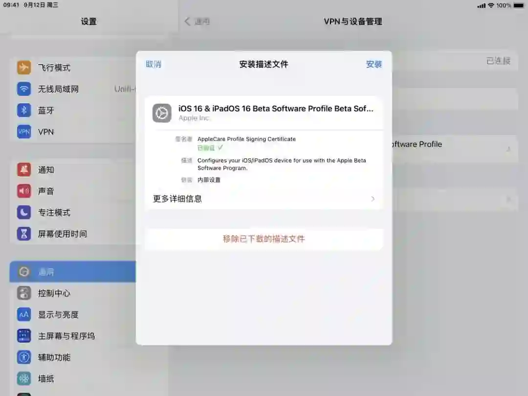 页面,登录并下载 iPadOS 16 的描述文件。下载后可以直接打开描述文件并安装,重启设备之后,你就可以收到 iPadOS 16 公测版系统的更新了。