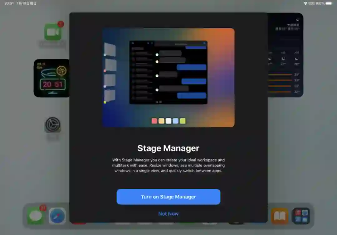 「台前调度」功能是 iPadOS 16 上新的多窗口管理系统,和 macOS 一样支持多窗口灵活操作。根据 WWDC 发布会上的说法,可以在一台 iPad 上同时运行最多 8 个 app 窗口。