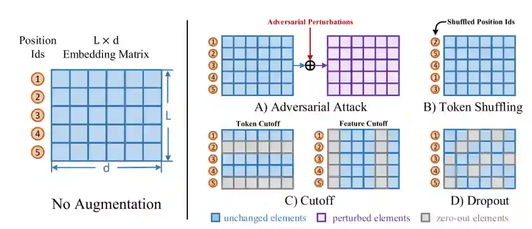 自然语言领域的扰动也大致可分为两类:词级别(token-level)和表示级别(embedding-level)。词级别的扰动大致有句子剪裁(crop)、删除词/词块(span)、换序、同义词替换等。表示级别的扰动包括加高斯噪声、dropout等。见图5。