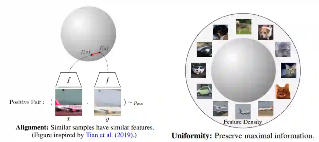 这里我们引入两个重要的概念,对齐性(alignment)和均匀性(uniformity)[10]。由于对比学习的表示一般都会正则化,因而会集中在一个超球面上。对齐性和均匀性指的是好的表示空间应该满足两个条件:一个是相近样例的表示尽量接近,即对齐性;而不相近样例的表示应该均匀的分布在超球面上,即均匀性。满足这样条件的表示空间是线性可分的,即一个线性分类器就足以用来分类,因而也是我们希望得到的,我们可以通过这两个特性来分析表示空间的好坏。