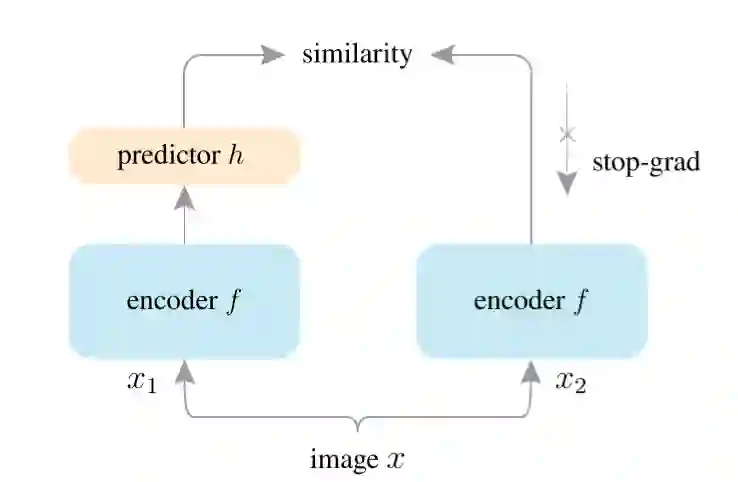 虽然BYOL强调动量更新对构造非对称结构避免表示塌缩非常重要,但SimSiam证明了真正重要的并不是动量更新,而是在于不求导操作。SimSiam的结构同BYOL基本一样,见图14,encoder由ResNet和一映射头组成。