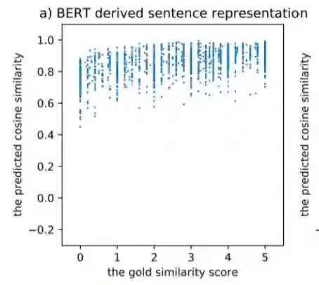我们都知道,通过以Bert为代表的预训练模型得到的词表示在广泛的下游任务上都取得了非常不错的表现,但是句子表示(无论是用[CLS]特殊字符还是平均池化得到)的表现远不如词表示这么亮眼。文献[17]指出,通过Bert学到的词表示根据词频呈现不均匀分布,高频词离原点更近且彼此间距离更近,低频词离原点更远且更稀疏,因此平均后高频词对最终句表示的影响更大,导致Bert学到的句表示对语义变化不敏感,如图15,横坐标为文本语义匹配数据集中对句子相似度的人工评分,纵坐标为对应的Bert句向量得到的相似度评分,会发现Bert句向量并不能很好的区分语义相近和语义不相近的句子,而对比学习通过告诉模型拉远负例间的举例,很好的解决这个问题。