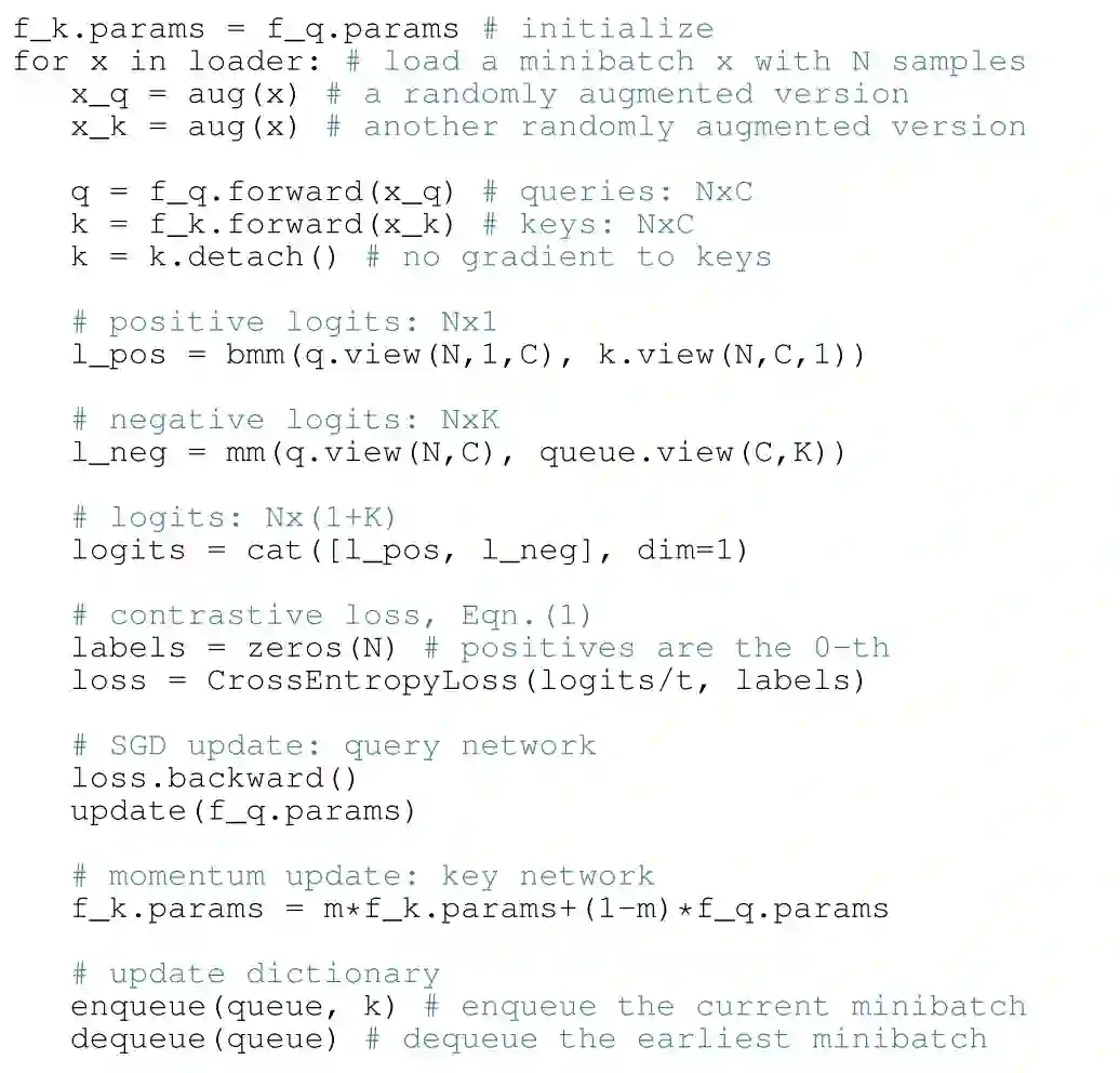 Memory Bank顾名思义,在开始训练之前,先将所有图片的表示计算好储存起来,叫做memory bank。Bank中的表示将作为负例的表示参与构建对比损失,每次迭代更新参数后,当前batch中样例对应的memory bank中的表示将会用更新后的参数更新,以这样的方式慢慢更新memory bank中的样例表示。这种方式就不需要对大量负样例做前馈和反向传播运算,大大降低了运算量。但是这种方式有两大缺点:1、当样例数目很大时,需要占用极大的内存。2、样例迭代太慢,由于不同步更新的表示对应的表示函数不同,第一步batch更新的表示和第10000步batch更新的表示对应的函数参数可能差别非常大,造成了不一致的情况,那这两种表示进行对比会有很大的噪声。MoCo则借鉴强化学习的一些工作,引入了动量更新来解决这一问题。