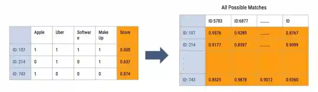 逻辑回归的公式会计算一个0到1之间的值,这是得到目标结果的概率,在本案例中是得到5星评价的概率。我们的目标当然是得到更高的概率。计算所有可能配对的得分并将其放到矩阵中。数据格式化的方式很重要,因为它将生成输入配对算法的原始数据。
