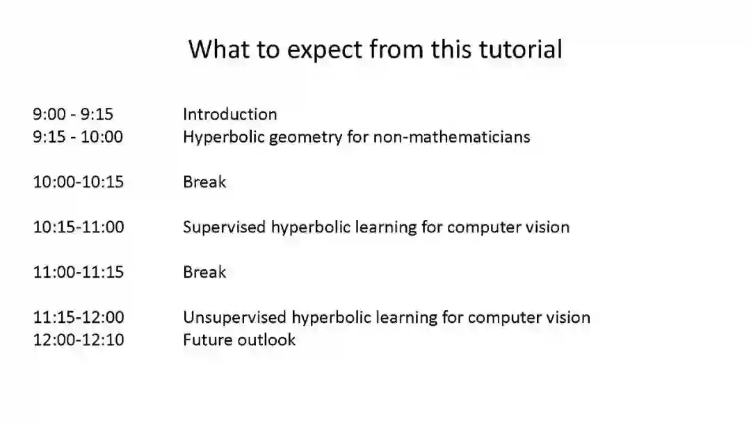 鉴于计算机视觉的双曲表示学习的最新进展,本教程试图向更广泛的受众宣传双曲几何及其在计算机视觉方面的强大潜力。本教程为该领域提供了一个理论和实践的起点。在会议上,我们将为非数学家提供一个简单的双曲几何介绍,在那里我们专注于直觉和高层次的理解。然后,我们从有监督和无监督的角度概述了视觉双曲几何的现状。最后,我们深入到开放的研究问题和双曲几何和视觉理解的未来潜力。