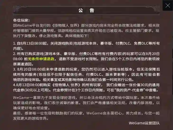 8 月 13 日上午,当我再次打开 WeGame 平台,像平常一样要进入怪物猎人世界时,一份简单的公告却宣告了游戏的末日。WeGame 运营团队表示,因游戏部分内容未完全符合政策法规要求,相关政府管理部门接到大量举报,游戏相应运营资质文件已被取消,将对游戏下架。