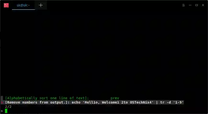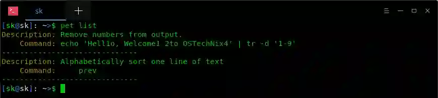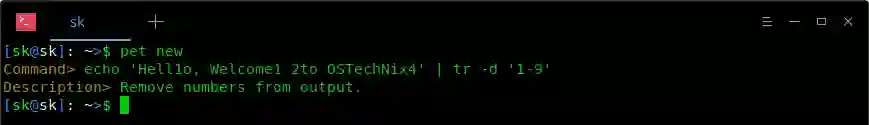 这是一个简单的命令,用于从 echo 命令输出中删除所有数字。你可以很轻松地记住它。但是,如果你很少使用它,几天后你可能会完全忘记它。当然,我们可以使用 CTRL+R 搜索历史记录,但 Pet 会更容易。另外,Pet 可以帮助你添加任意数量的条目。