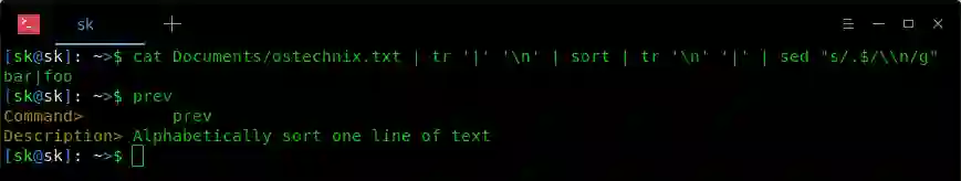 $ cat Documents/ostechnix.txt | tr '|' '\n' | sort | tr '\n' '|' | sed "s/.$/\\n/g"