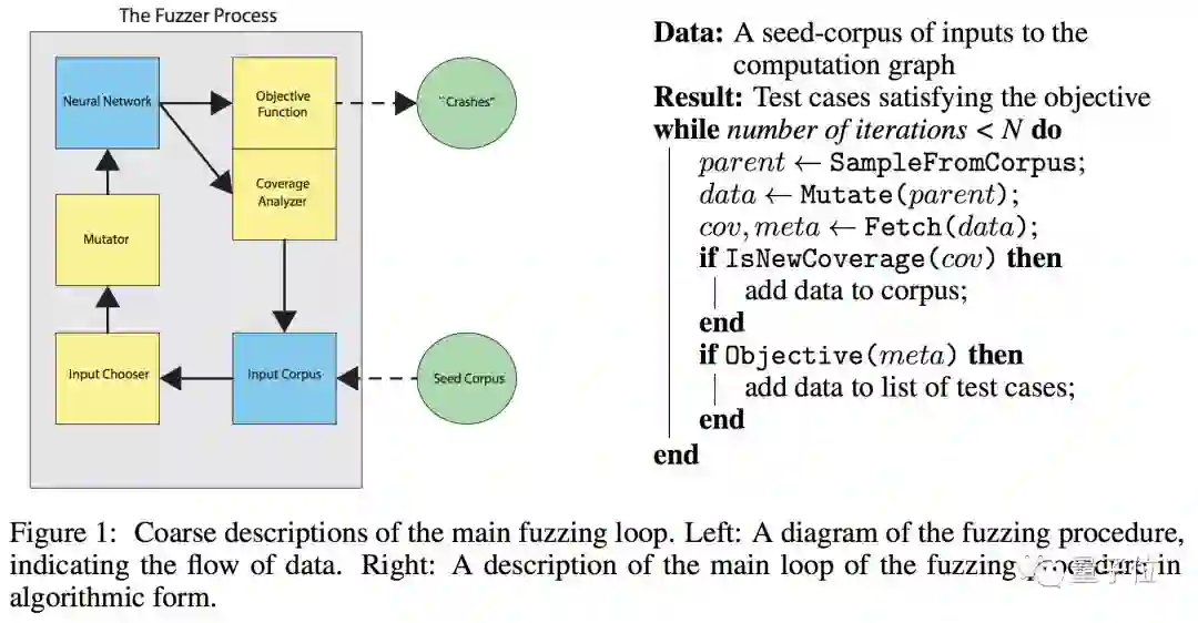 粗略地说,TensorFuzz是通过查看计算图的“激活”来测量覆盖率。整体架构如下图所示,左边是模糊测试的程序图,标明了数据如何流动;右边以算法形式描述了模糊测试过程的主循环。