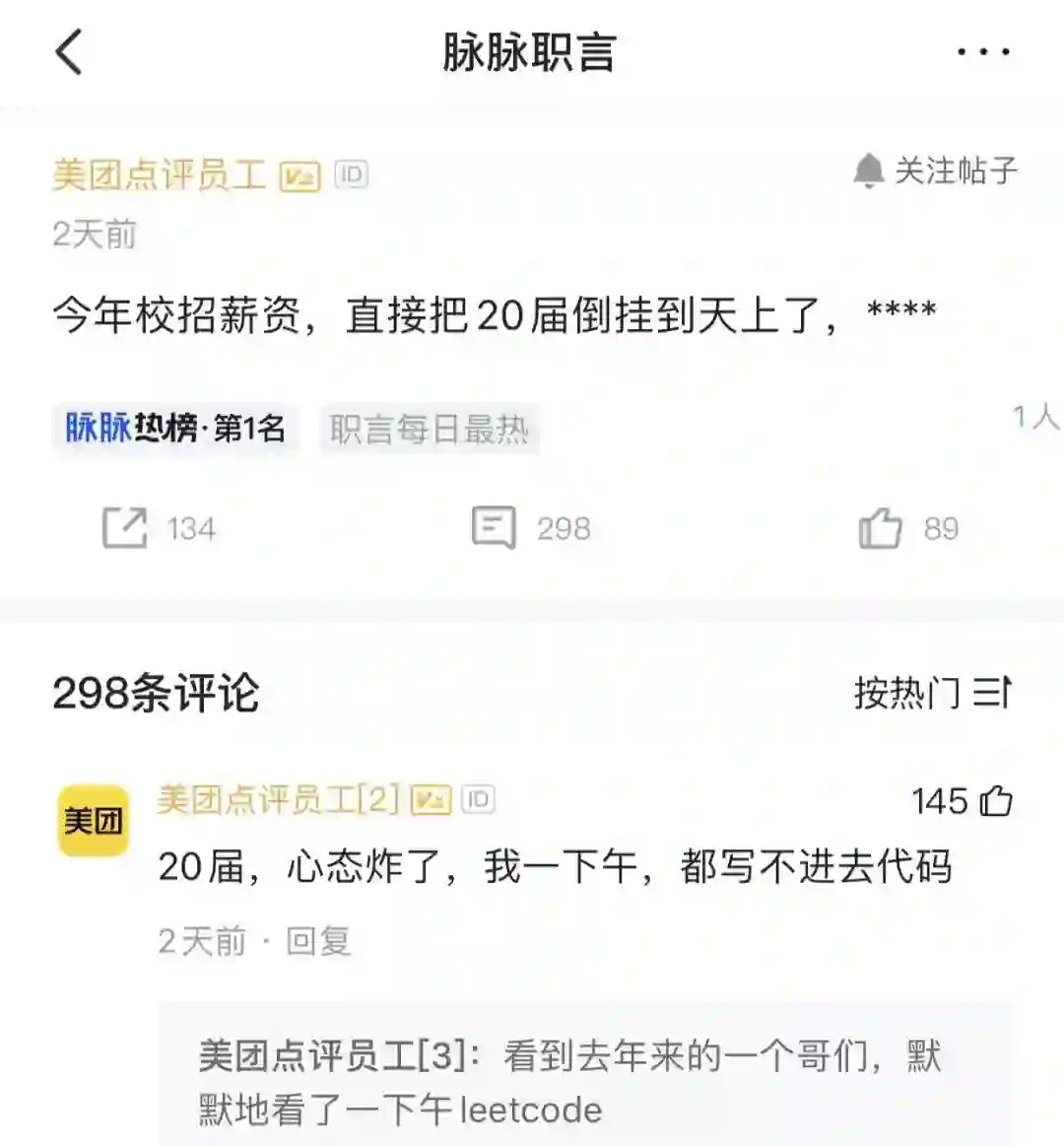 消息传出后,“网传美团今年应届生年薪 35w+,严重倒挂老员工,为什么互联网大厂校招的薪资一年比一年高?”话题迅速登上知乎热搜,引发激烈讨论,有美团内部人员看到消息后留言表示自己“写不进去代码了”。
