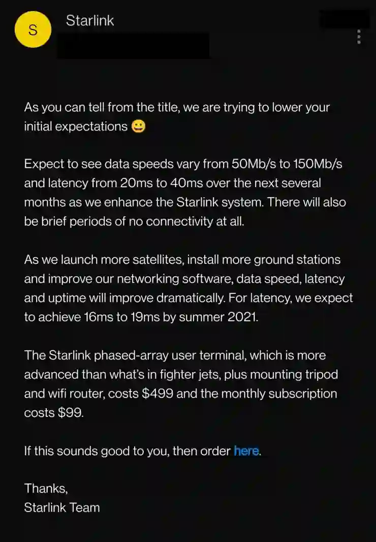 马斯克此前承诺,星链计划全部完成后,将为全球所有用户提供最高 1Gbps 的宽带服务,以及 25 毫秒的超低延迟。但是根据截图内容显示,此次公开测试的结果显然还无法兑现马斯克当初的承诺。SpaceX 在发送给用户的邮件中也明确说明了这一点。