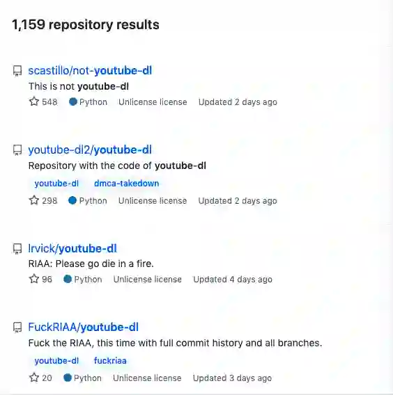 到现在为止,RIAA 的下架令明显起到了反效果,很多开发人员开始对此表示抗议,并发布了更多代码副本。目前 YouTube-dl 的在线副本数量已经达到历史新高,这场打击行动,反而成了 YouTube-dl 的一场宣传与狂欢。