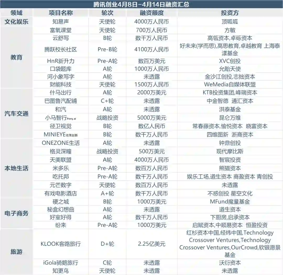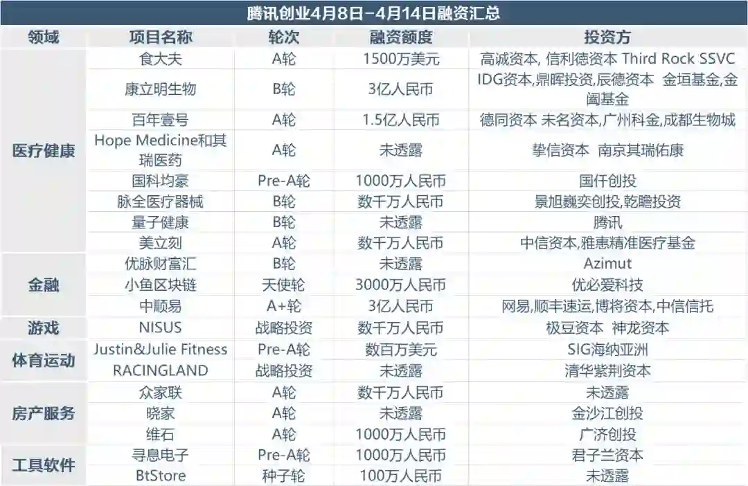 以上便是今天的企鹅数钱精编融资内容。如果你获得了融资,希望得到我们的关注,请联系我们:startup@tencent.com