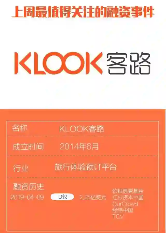 上周最值得关注的项目是KLOOK 客路旅行获得2.25亿美金融资,KLOOK 客路旅行成立于2014年,主要为旅行者提供便捷的“自由行玩乐预订服务”,包括全球 270 个目的地的热门景点门票、一日行程、特色体验、当地交通及 WiFi、美食餐饮等共计超过 10 万种当地行程与旅游服务,公司目前有超过 1000 名团队成员遍布全球 20 个办公室,支持 9 种语言、41 种货币支付。