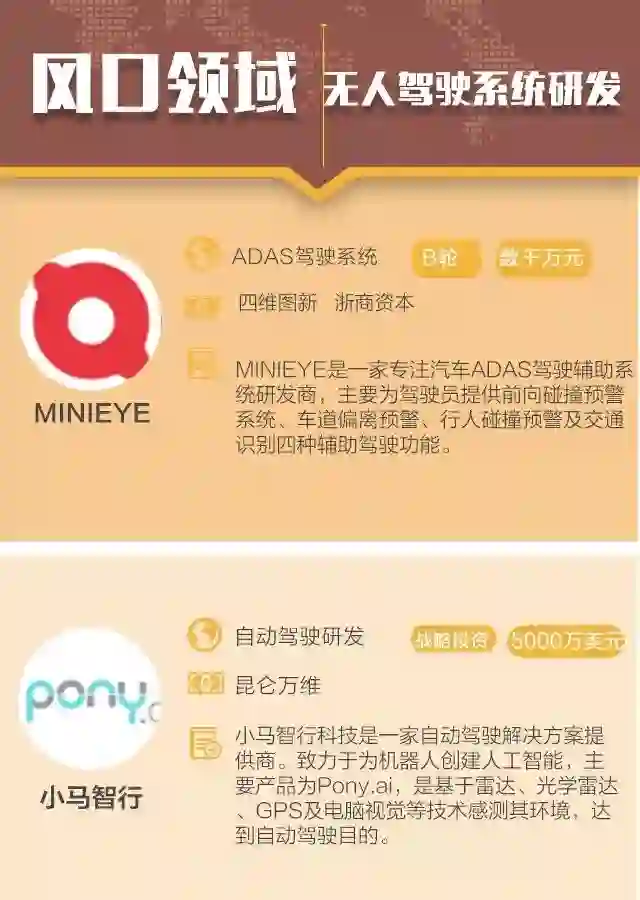 上周的风口行业为无人驾驶,最值得关注的项目为Minieye及小马智行获得融资,MINIEYE致力于研发车载视觉感知技术和产品。目前公司提供定制化的ADAS解决方案,可根据合作方不同的需要提供含有不同功能的ADAS产品。主打的基础功能板块有前向碰撞预警,车道偏离预警,行人碰撞预警和自动紧急制动。小马智行科技是一家自动驾驶解决方案提供商。致力于为机器人创建人工智能,主要产品为Pony.ai,是基于雷达、光学雷达、GPS及电脑视觉等技术感测其环境,达到自动驾驶目的。