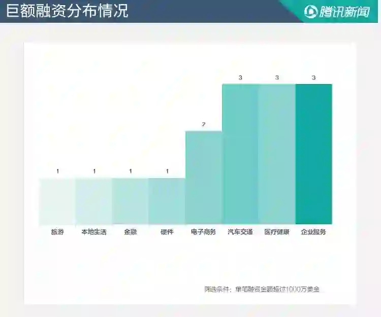 单笔融资金额超过1000万美金的融资事件共有15个,和上周相比上升1个,上周巨额融资事件主要集中在企业服务、医疗健康、汽车交通领域。