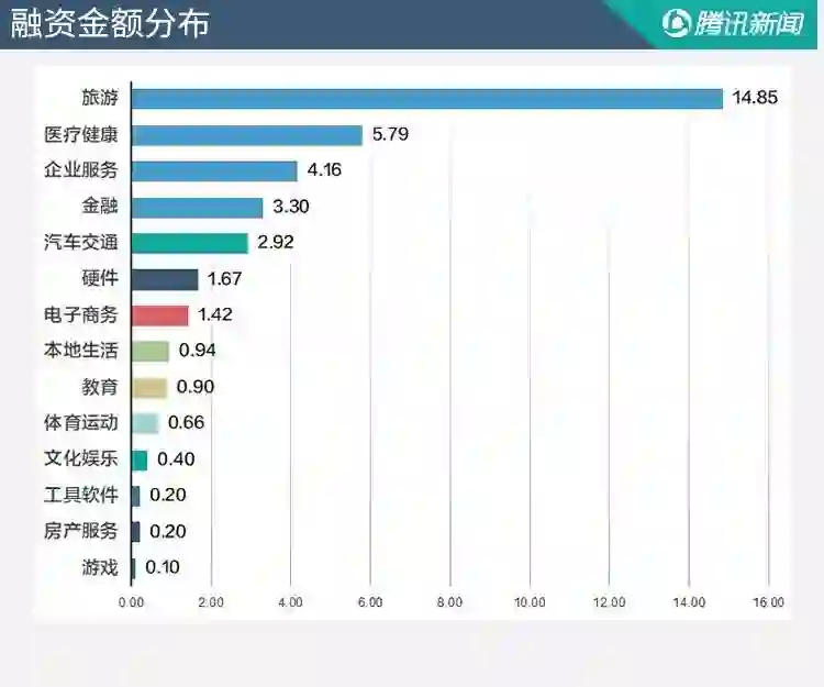 上周共有64个项目获得投资,累计金额超37.51亿人民币,旅游领域成为上周最吸金的领域,融资金额超过14.85亿人民币,其次为“医疗健康”领域共获得了5.79亿人民币融资。