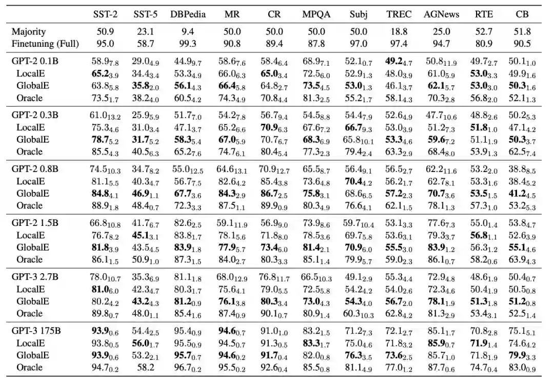 相对于不挑选prompt展示顺序的方法而言,使用GlobalE和LocalE的方法平均取得了13%与9.6%的提升。这表明,基于熵和无标注数据生成的选取方法是有效的。