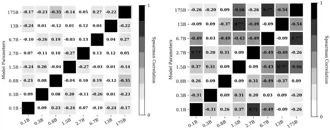 优质的展示样本的顺序,也没有什么明显的规律。 如果优质展示样本的顺序存在一定规律,那应该具有一定的可迁移性,即在不同模型下,性能都比较好。然而,这一规律并不存在。不同模型下优质的展示样本之间具有很大差异。下图显示的是不同展示样本顺序在不同模型的表现之间的斯皮尔曼秩相关系数。左图针对展示样本顺序(4!=24个),右图针对展示样本标签顺序(由于2正2负,一共有6种)。可以看出,不管是样本顺序,还是标签顺序,都不具备跨模型迁移能力。因此,优质的展示样本的顺序,也没有什么明显的规律。