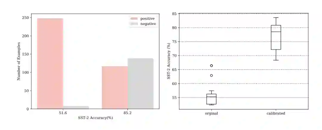 更大模型难以完全避免模型表现随prompt顺序变化的波动。 SST-2任务(上图左)中,貌似随着模型增大,波动变小了很多。但在subj任务中(上图右),即使是175B的GPT-3模型,表现依然会随着prompt的顺序有很大的波动。