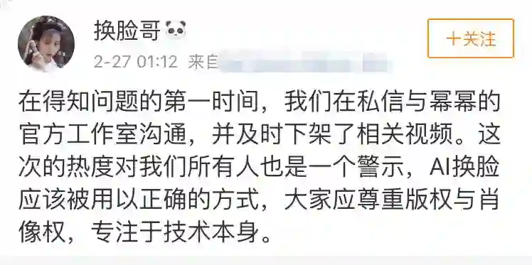 27 日,杨幂“换脸”视频的制作者回应,制作视频的本意是用于技术交流,并无营利行为,但已将相关视频下架,并表示:“对所有人来说是一个警示,大家应尊重版权与肖像权,专注于技术本身。”